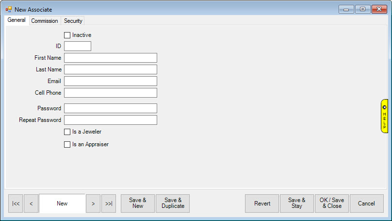 2. Select Add. The New Associate window will appear with the General tab selected.