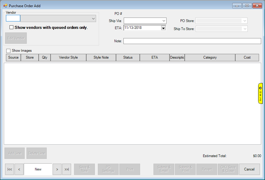 1. Select Inventory ► PO ► Add. The Purchase Order Add window will appear.