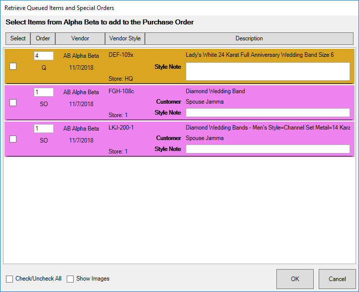 2. Select the vendor for this order. The Retrieve Queued Items and Special Orders window will appear. Note that if you choose a vendor for whom a purchase order exists, you will be prompted to open that purchase order and add items to it.