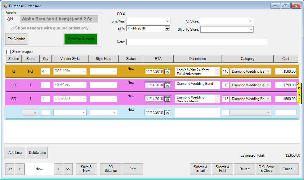 For the purposes of the Retrieve Queued window and the Purchase Order window, line items will be color-coded as follows: