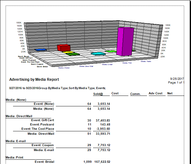 Advertising reports detail sales as a result of paid advertising and special events. Both Media and Events reports are displayed with a bar chart and a table listing results. This is where the Why In field in the Point of Sale window is useful. The advertising reports both require only a time frame for which events should be included.