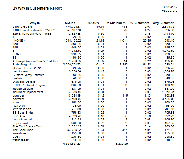 If you track the occasion that brought a customer into your store, the By Why In report can help track such activity and help plan promotions, postcards, and other targeted marketing. For more about report filters and settings, see the section entitled Creating a Report.