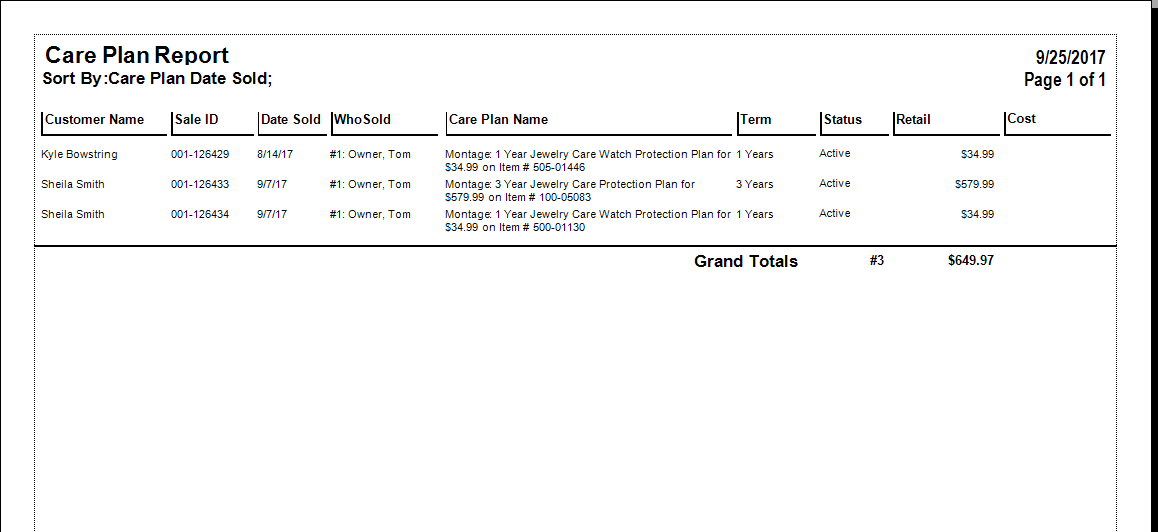 The Care Plan report lists care plans sold, the items associated with them, and their status.