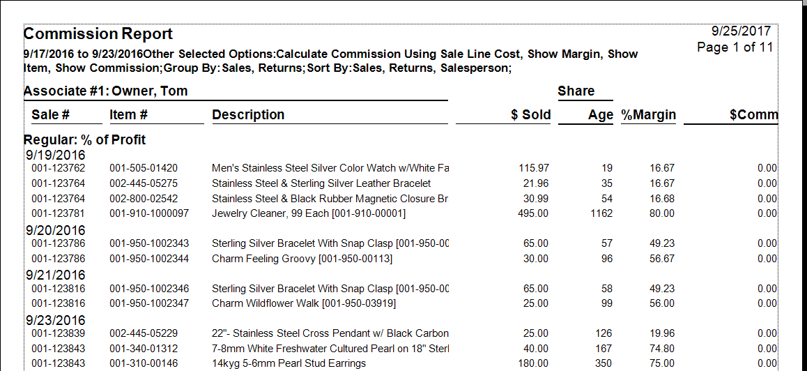 The Commission report details sales achieved by a particular associate and the commissions earned. It requires that you select a time frame for transactions. There is an option to include cost information, which results in the percent margin to be displayed. In addition, you can narrow the report by customer criteria, store, and station number.