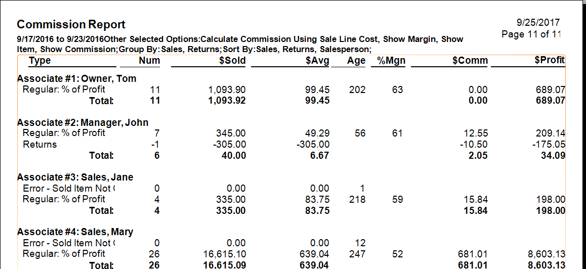 •On layaway, repair, and special order transactions, commission is credited to the associate who originally processed the intake regardless of who processes subsequent payments and pickups. •If the Count Giveaway as a Penalty for % of Profit is checked, giveaways will affect the associates’ commission. If it is not checked, giveaways will not penalize the associate’s commission. This can only be calculated if the associate is set up for commission based on percent of profit. If the associate is set up for percent of retail, then the commission calculated will always be zero anyway, as the sale price for a giveaway is zero. If the associate is set up for commission based on percent of profit, and the box is checked, then the penalty for the giveaway will be the commission percentage times the giveaway item’s cost (not price). •Sales tax is not a factor in Commissions and therefore is not reflected in this report. |