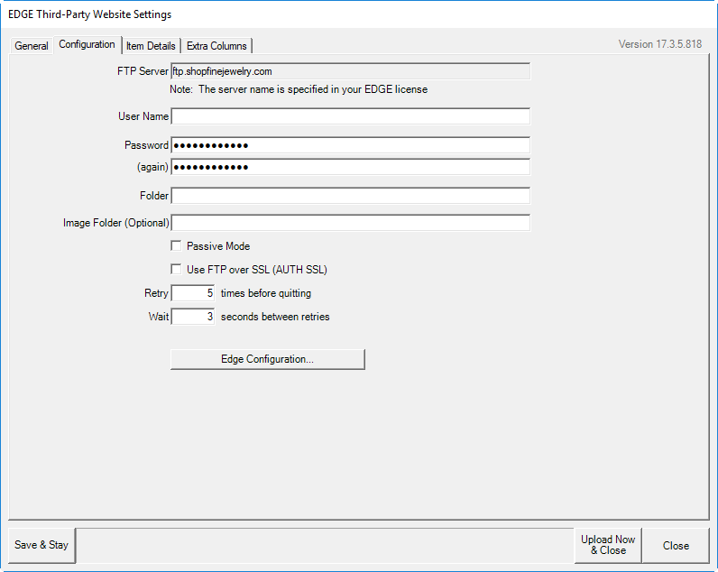 The Configuration tab contains fields to enter information necessary to access the website. You may need to obtain this information from your website host provider. Fields include: