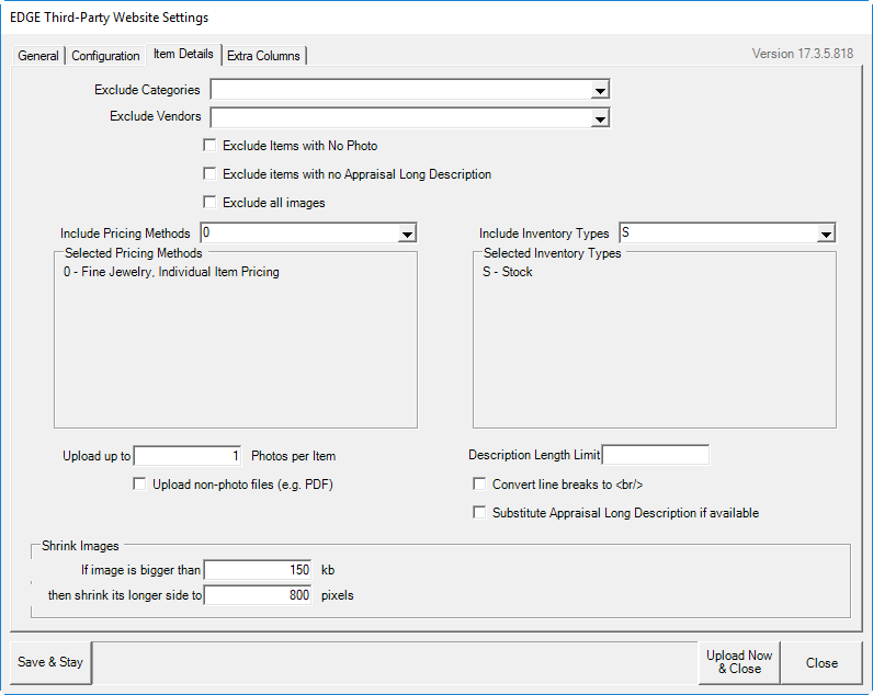 The Item Details tab allows you to filter items uploaded by vendor, pricing, and description. It also helps size images to ensure picture files aren’t too large for the web. Fields and options in the Item Details tab include: