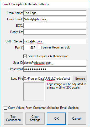 To send email receipts and job details sheets, The Edge must be configured to use the email settings associated with your store email account. The fields marked with an asterisk below are specific to your email account. You should contact your email vendor or ISP (Internet service provider) and ask them specifically for this information.