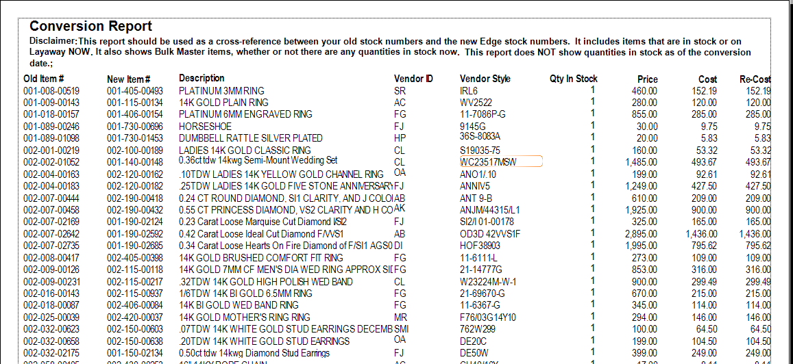 The Conversion report assists in the conversion from an old item number system to a new one.