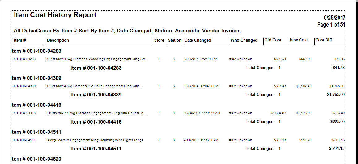 The Cost History report shows a history of changes to the cost of an item. Older versions of The Edge might not have recorded cost history for bulk items. Be aware that if a single item was changed more than once, it may be represented on this report more than one time. Therefore, the value of the grand total may be inflated.