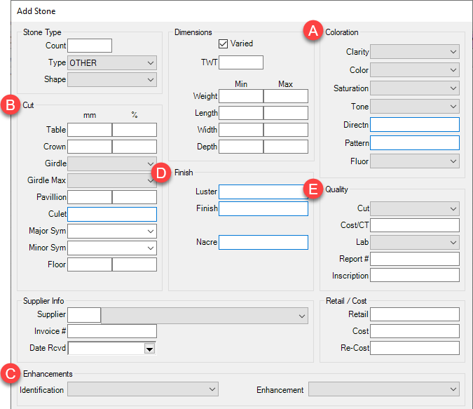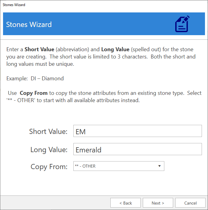 5. Use the Copy From drop-down to specify an existing stone to copy details from. To start with all available fields, select ‘** - Other’. Then click Next.
