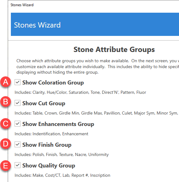 6. Stone attributes are split into six groups. You can uncheck a group to stop it from showing up. Select the groups you wish to display, then click Next.