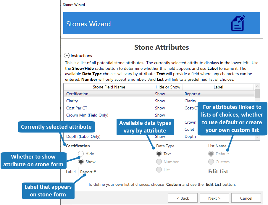 7. This screen allows you to customize the individual stone attributes.