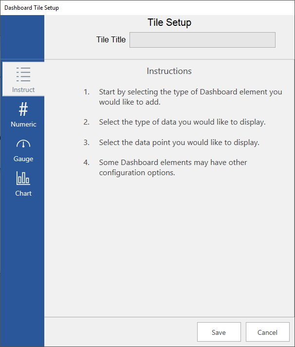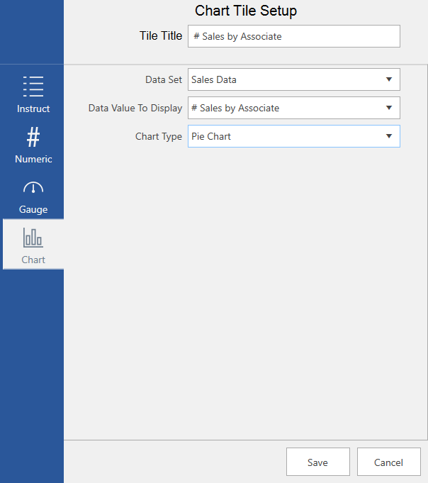 Displays a pie, bar, or doughnut chart; best used with 2 by 2 tiles |
