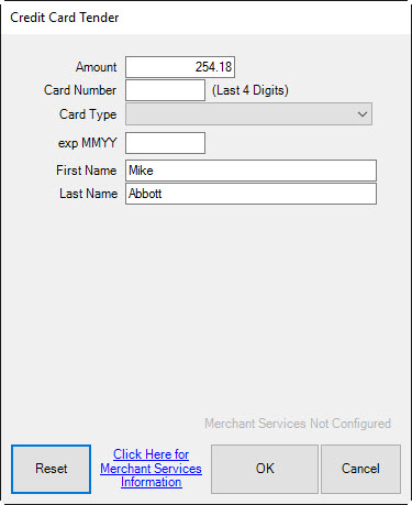 1. Select Credit Card. The Credit Card Tender window will appear.