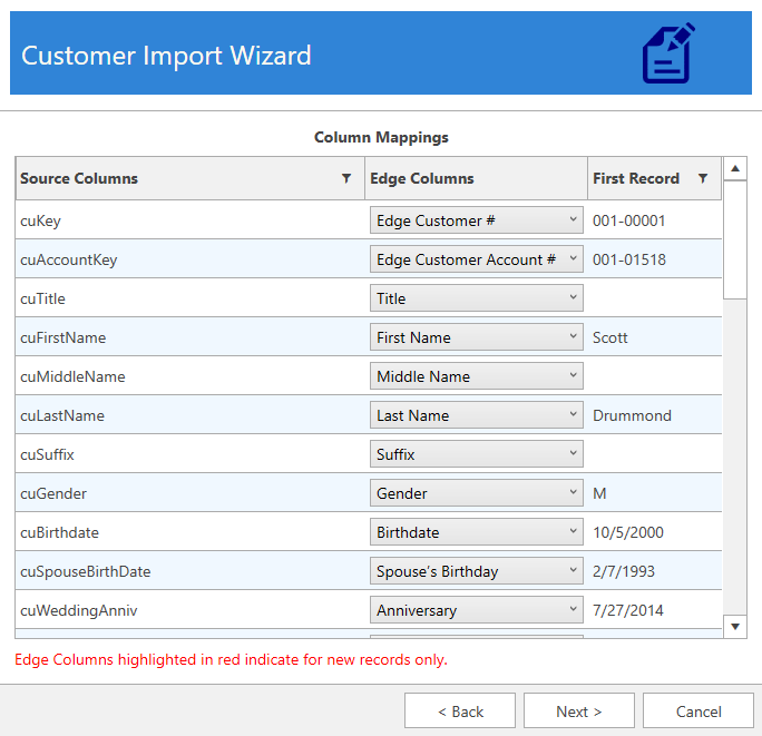 If you are importing changes to existing customers the import file must include the Edge customer number. Any records missing an Edge customer number will be imported as new customers. |
