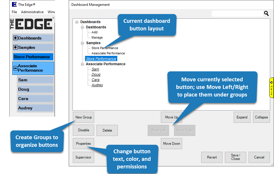 When creating new Dashboards, each will show up as a button on the left. You can use Dashboard Management to change the order, and grouping, of these buttons. To do so: