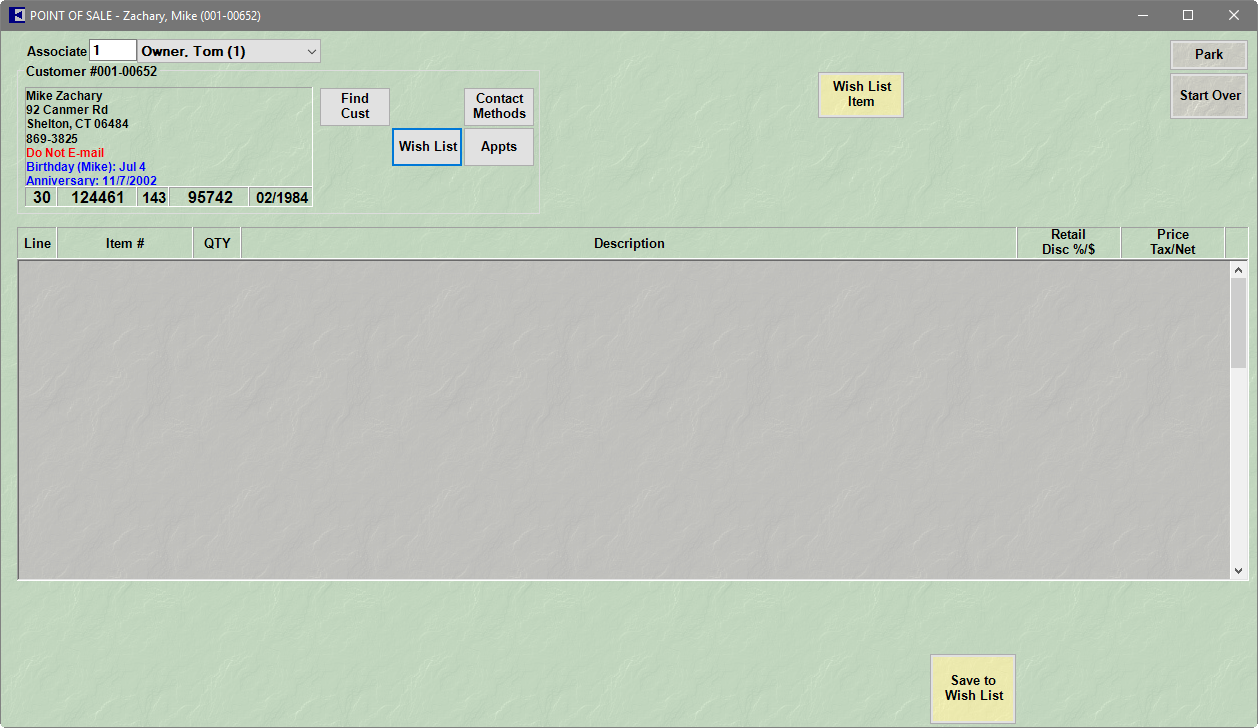 Wish List Entry Mode offers a view of the Point of Sale window that allows for much more wish list flexibility. It does not require that the item be in stock. In fact, wish list items can be rough ideas or descriptions of items. To use Wish List Entry Mode: