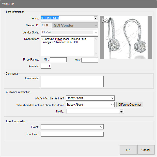 6. Select the Modify Wish button. The Wish List window will appear with some of the fields populated based on the data entered at point of sale.