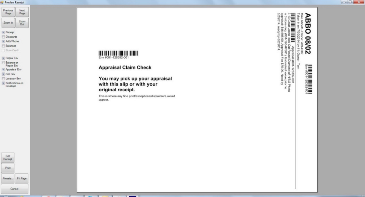 Services such as repairs, special orders, and appraisals include an envelope insert along with the receipt. It is intended to fold up and slip into a clear envelope that contains the item on which to be worked. Envelopes are generated in the Preview Receipt window, usually as a second page to the receipt.