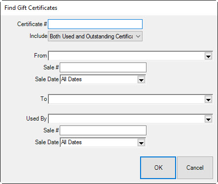1. Select Gift Certs ► Find from the Customer menu. The Find Gift Certificates window will appear.