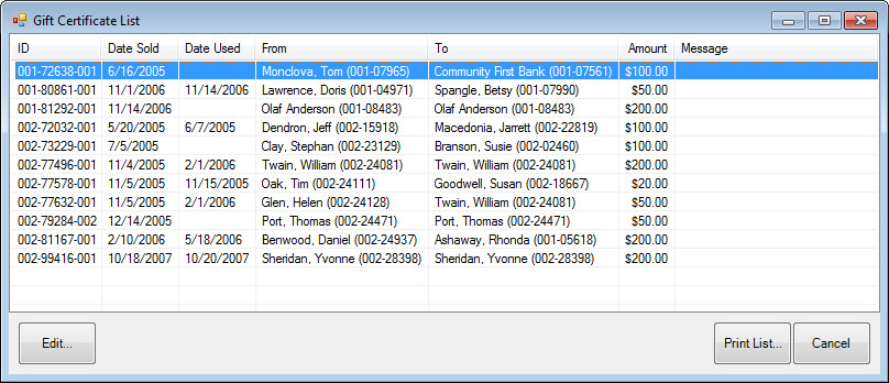 4. The Gift Certificate List along with basic information about each will appear on the window.