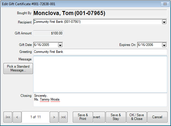 1. Select a gift certificate from the Gift Certificate List and select Edit or double-click on the record. The Edit Gift Certificate window will appear.
