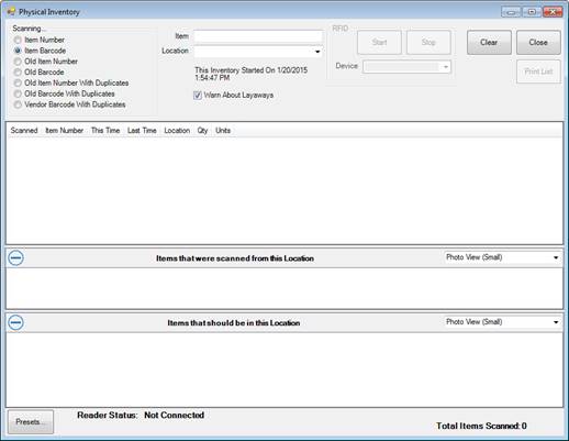 Items are saved as you scan. This closes the Physical Inventory window. | |||