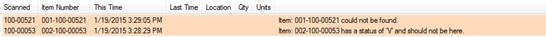 8. As you scan barcodes or enter item numbers, a list will be generated on top portion of the window showing all items entered. Each time an item that was previously recorded in The Edge as in inventory is scanned, which appears in the lower portion of the window, that item will be moved from lower portion to the middle portion. Messages may appear indicating action taken or action to be taken. Examples include: