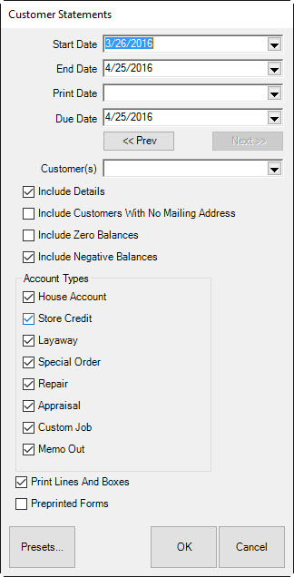 1. Select Statements ► Print from the Customer menu. The Customer Statements window will appear.