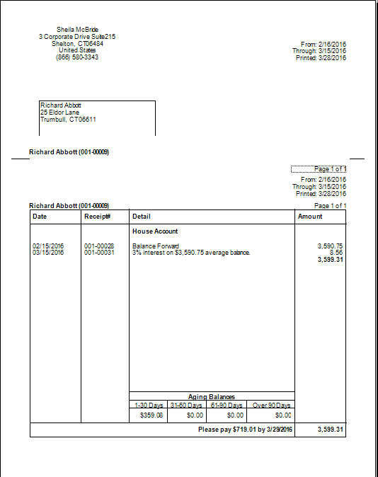In the event of aged balances, there is a line that reads “x% interest on $x average balance.” This is the calculated finance charge based on the parameters that you set up in System Options. Note that the “average balance” is calculated as the balance per day added together then divided by the number of days in the billing cycle.