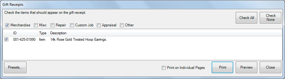 Select types of transactions to include gift receipts for: Merchandise, Misc, Repair, Custom Job, Appraisal, and Other. |