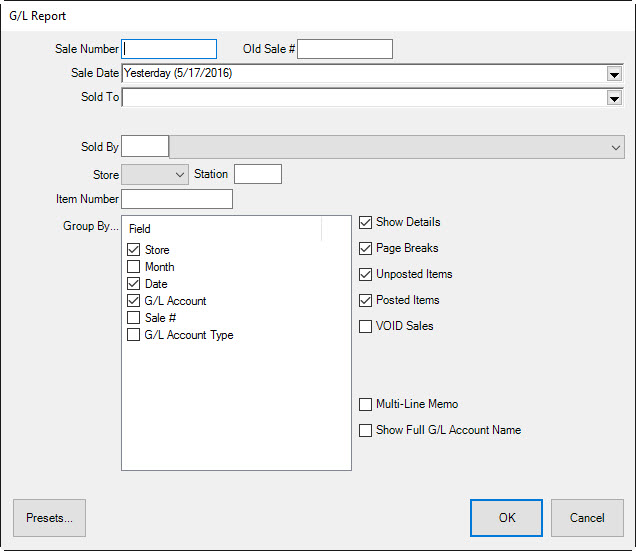 Allows you to specify a single sale number. Useful for seeing how a particular transaction will post or has posted to QuickBooks. | |||