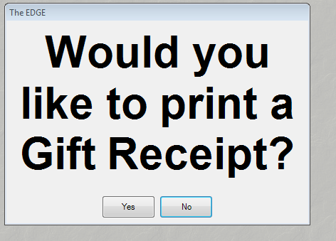 If you have both Preview and Ask Before Printing Receipt set to False, AND Ask to Print Gift Receipt set to True, The Edge prints a receipt silently as usual, but will offer the “Would you like a gift receipt?” option. If you select Yes, the gift receipt picker will appear.