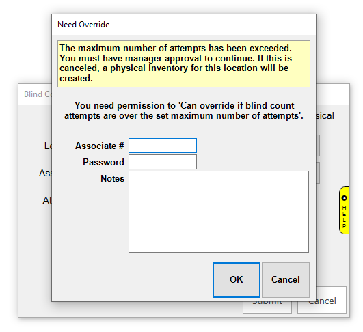 If the system option is set to force a Physical Inventory on a Blind Count with too many failed attempts, and an override by management is not entered, a Physical Inventory is automatically created.