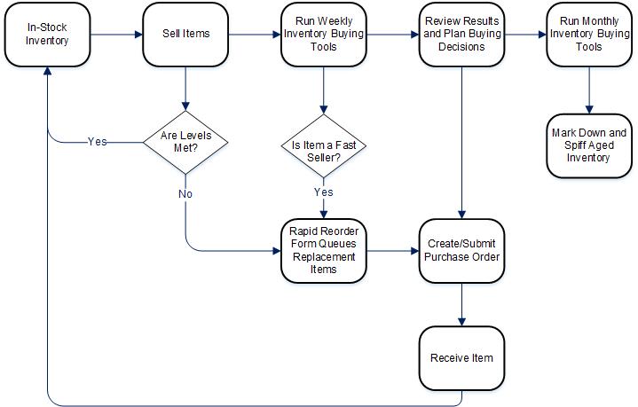 In general, here's how it works: Items come in and you sell them. Based on sales history and trends, The Edge's Levels and Rapid Reorder features work together to queue good sellers for replacement. Then the Purchase Order feature makes it easy to retrieve queued items, order them, and receive them into stock. All the while, the Edge tracks sales data and through the use of the Inventory Buying Tools, which will help make strategic decisions about what you should obtain more of what sells and what you should do to move old inventory.