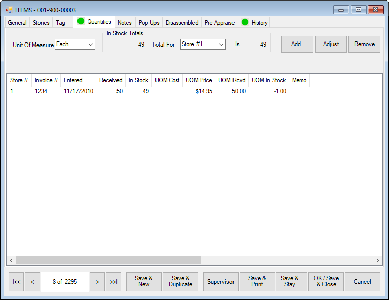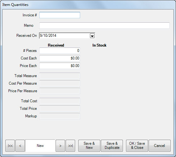 Although you will probably add inventory from invoice as described in the section entitled Add Item from Invoice, you can do so here. To manage quantities from the Quantities tab: