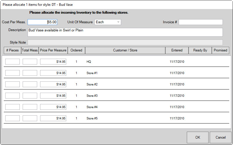 Recommended for melee diamond parcels. Requires you to specify unit of measure, the number of pieces, total measure, cost (per measure), and price (per measure). This method allows you to keep track of a physical count and measure. For example, if you stocked a three-carat parcel of melee the total measure would be 300 points while the total number of pieces would equal the number of physical stones on the parcel.