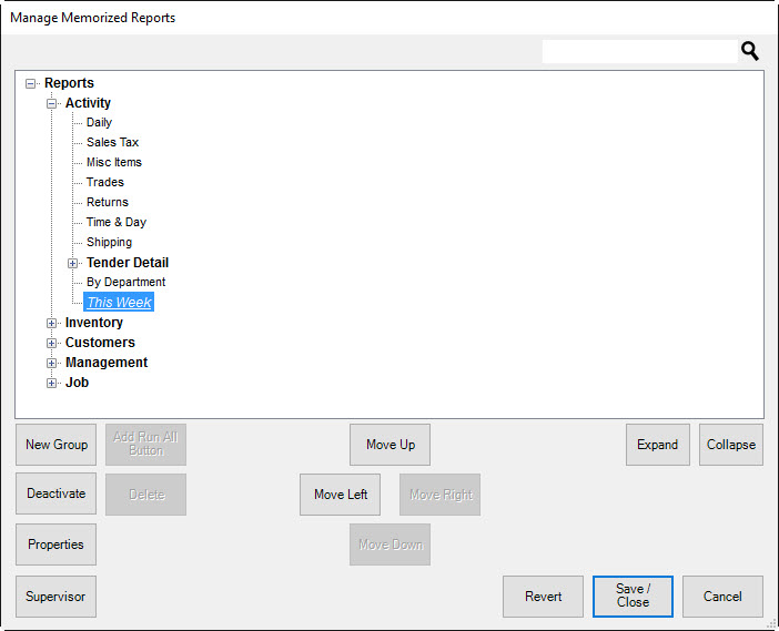 The hierarchy of reports shown will mirror what is shown in the main Reports window. Also notice that the reports you created are in italics. What you arrange here is what will appear in the Reports window. Options in the Manage Memorized Reports window include: