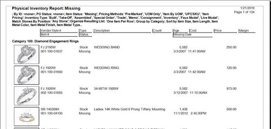 The Missing report provides a listing of items that were marked missing during the physical inventory process. The filter for the Missing report is the same as that for Item Find. You may modify the Status Date but the default will be the date of the last Physical Inventory Start Date.