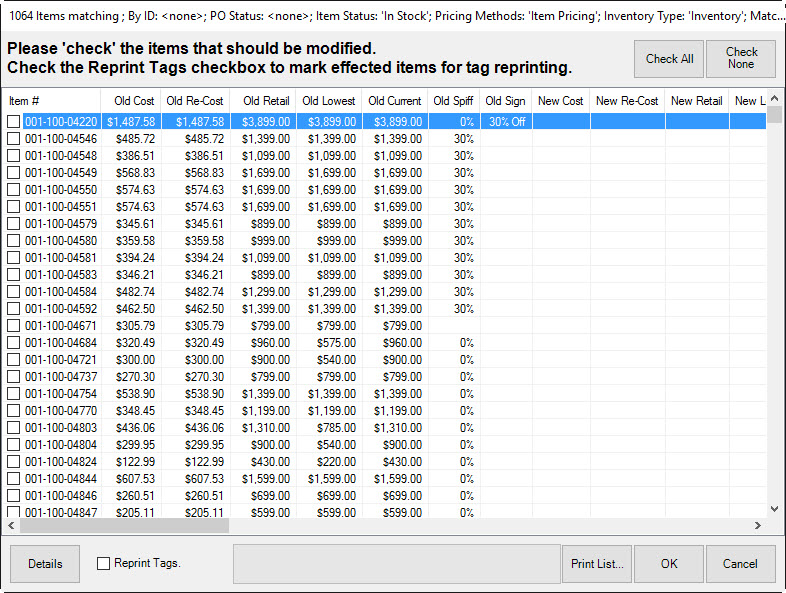 This window shows items that qualified for repricing based on the category automatic mark down tables. Each item is shown alongside its pertinent details. Also included is the old and new pricing information. Check those items to proceed with repricing and select OK.