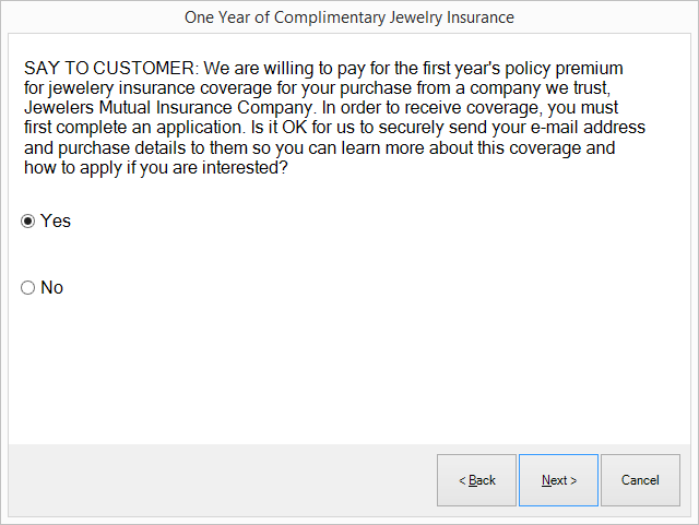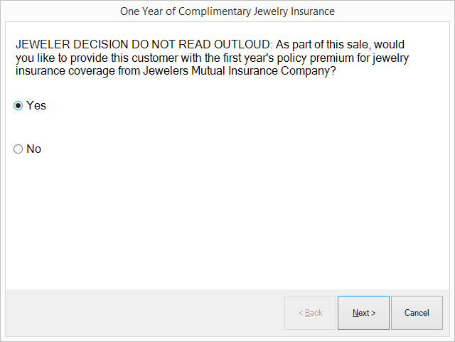 1. Conduct a sale as usual. When you select Done to complete the sale, you will be prompted to decide if you want to offer the one-year free premium option to the customer. This is only permitted for stores located in, and customers who live in, eligible states and by agreement between Jewelers Mutual and the retailer. If this option does not appear, proceed as described in the section entitled Offering the Quote without a Free Premium.