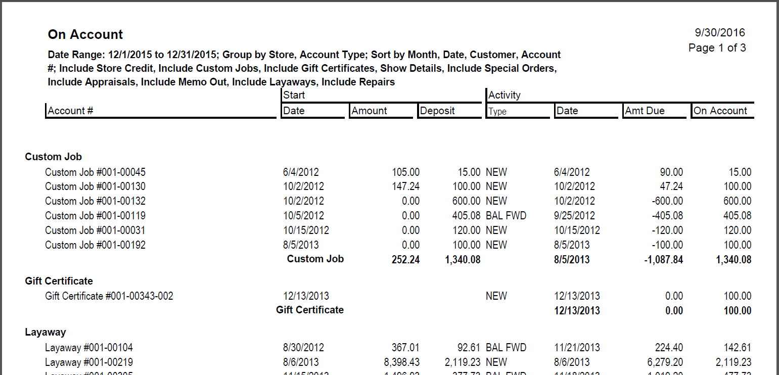 The On Account report lists all customer deposits on account including open transactions such as layaways, special orders, repairs, etc. This report is used specifically to account for customer deposits liability. For this report, despite the date selection, this report query is modified to include balances forward from previous dates and activity for the specified date range. The end date of the report will determine the cutoff point for the on account balances. For example, if you wish to see detail for on account transactions for last month and by account type, run the report as follows: Set the activity date to last month, check Account Type in the Group By field, and check all appropriate account types from the option that you want to report on. The report returns balances for all accounts that have a balance as of the selected end date, regardless of start date. Detail for transactions will be included for only the selected date range.