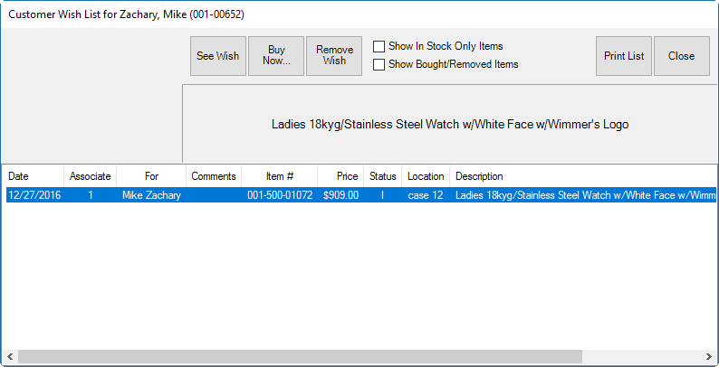From POS, if you have a customer selected and select Wish List ► Show My Wish List Items, The Edge returns a listing of items associated with the customer. For more about working with this list, see the section entitled Wish List Tab.