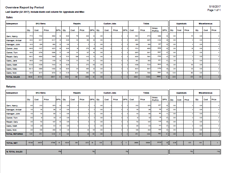 The Overview Report by Period shows items sold, cost of goods sold, and pricing by associate, all broken by transaction type. And it shows returns by associate, too, for net results. There is an option to include the Cost column for Appraisals and Miscellaneous.