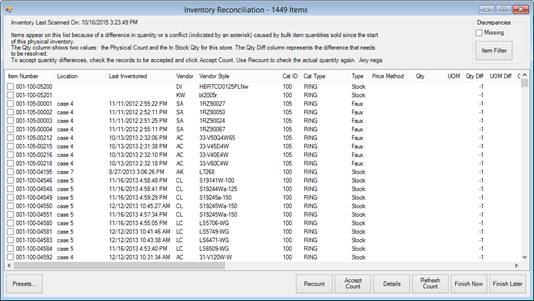 1. Select Inventory ►Physical Inv. ► Reconcile/Finish. A list of discrepancies will appear in the Inventory Reconciliation window.