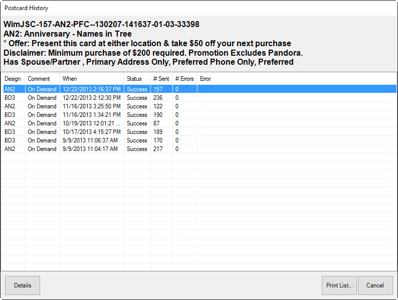 1.  From the Customer menu, select Postcards History.  The Postcard History window will appear.