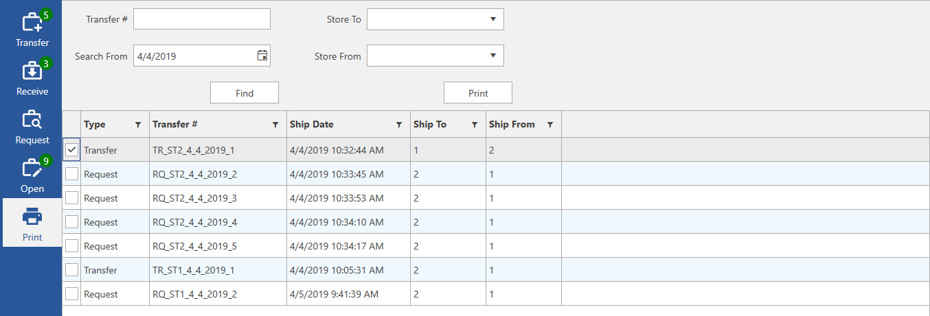 This tab is used to print transfers. Each printed transfer will show shipping information as well as a list of all included items.