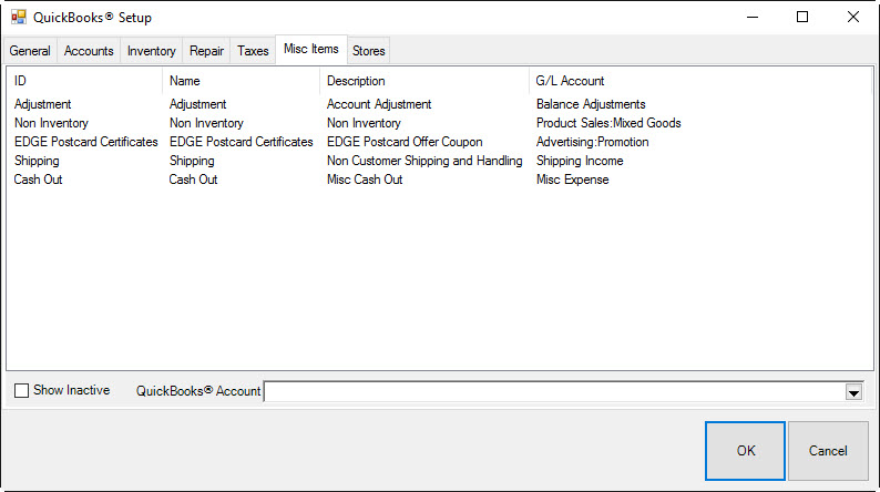 The Misc Items tab is used to associate each of your miscellaneous sales line definitions to a QuickBooks account. Whenever you sell via a miscellaneous sale line, the amount is posted to the corresponding G/L account, and an offsetting amount is posted to accounts receivable. Any tender is then in turn posted against the accounts receivable.