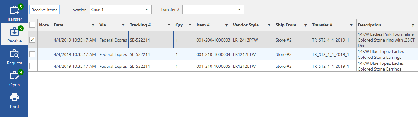 This drop-down will show open transfers waiting to be received. Selecting an open transfer will filter the list to only display items on that transfer. |